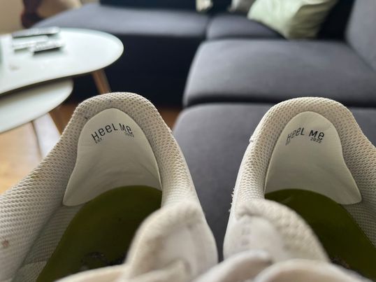 Peel of the backsticker and place Heel Me® in the damaged area. Let the adhesive stick to the shoes material.